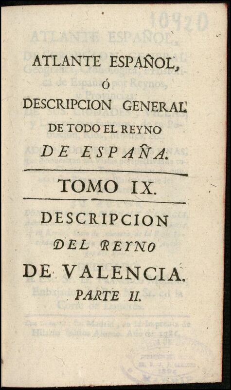 Atlante español: o Descripcion general geográfica, cronológica, è histórica de España, por Reynos, y Provincias de sus ciudades, villas y lugares mas famosos, de su poblacion, rio, montes, adornado de estampas finas.. ? [T.9]