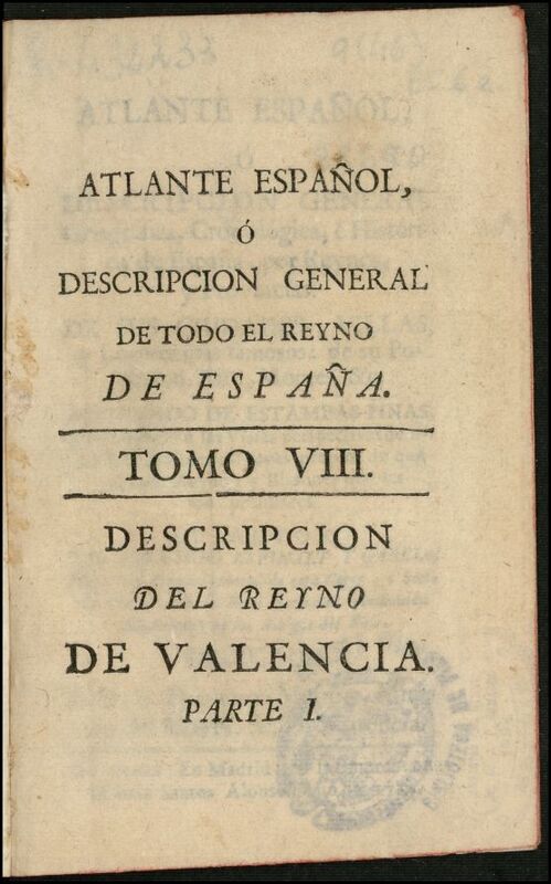 - Nota a la descripción física: Ilustraciones : 1 : "Mapa del Reyno de Valencia...". 2 : "Atlante español..., Tomo 8, Reino de Valencia [trajes típicos y escudos], Palomino ft". 3 : "Vista septentrional de la ciudad de Valencia". 4 : "Vista oriental de la ciudad de Segorbe". 5 : "Vista meridional de la ciudad de Orihuela". 6 : "Vista oriental de la ciudad de Alicante"