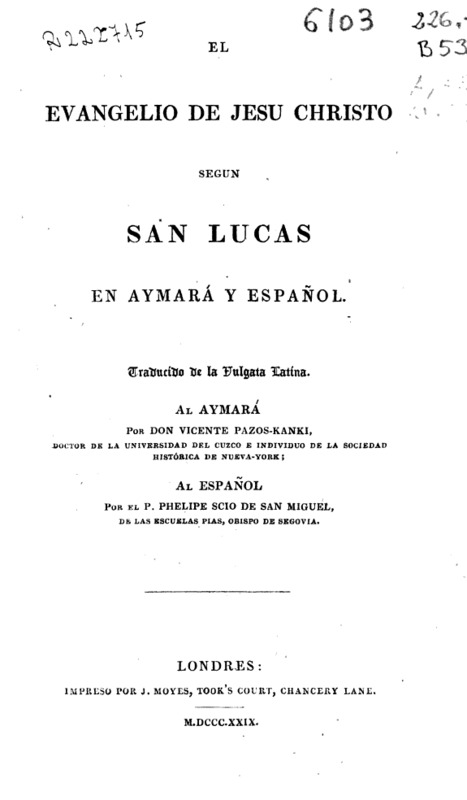 El Evangelio de Jesu Christo segun San Lucas en aymara y español. Traducido de la vulgata latina. Al aymara por don Vicente Pazos-Kanki, ... ; al español por el p. Phelipe Scio de San Miguel, ..