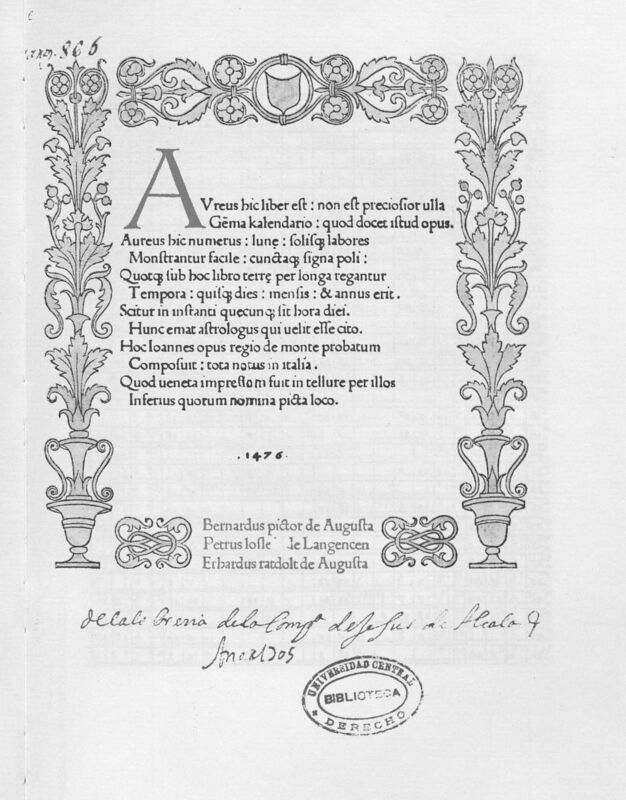 - Venetiis : Bernardus Pictor, Petrus Loeslein et Erhardus Ratdolt, 1476 del ejemplar BH INC I-287 conservado en la Biblioteca Histórica de la Universidad Complutense de Madrid