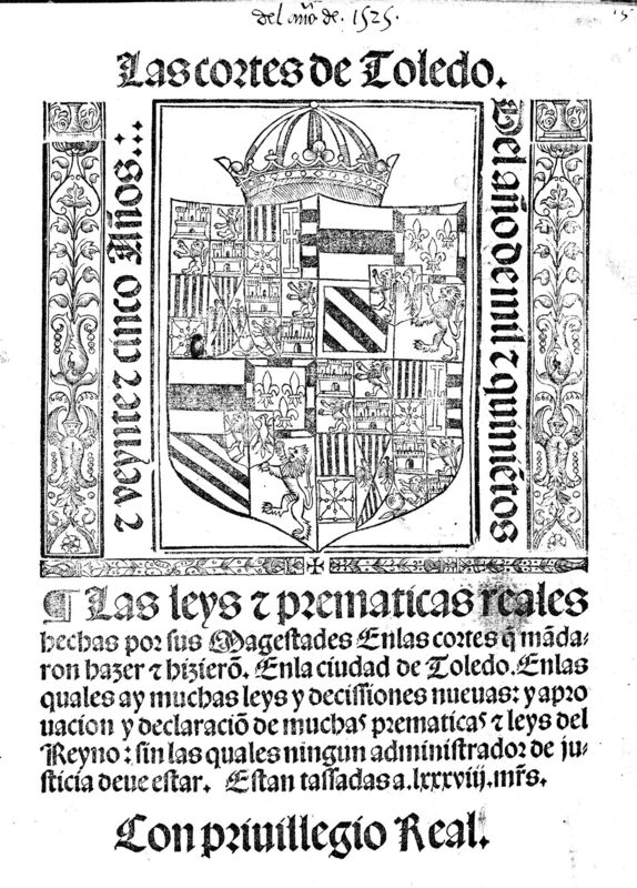 Las cortes de Toledo Del año de mil y quini[n]etos y veynte y cinco años : Las leys [et] prematicas reales hechas por sus Magestades en las cortes q[ue] ma[n]daron hazer ... en la ciudad de Toledo ..