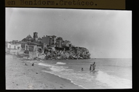 - Formaciones rocosas sobre las que se encuentra parte de la localidad de Benidorm, con la iglesia y el palacete de los Payá, y la playa de Levante en primer plano, con bañistas