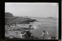 - Mujeres y niños en la playa de Torrevieja, Alicante, con barcos al fondo