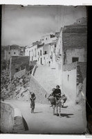 - Casas de Mojacar, Almería, con una mujer y niños sobre un burro que porta cántaros, en primer plano