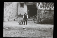 - Hombre y niña posan junto a un arado en la puerta de una posada