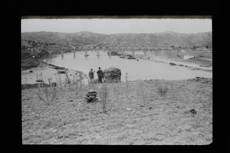 - Dos hombres contemplando el río Tajo a su paso por la zona de Garrovillas de Alconétar, con los puentes del ferrocarril y de la carretera al fondo