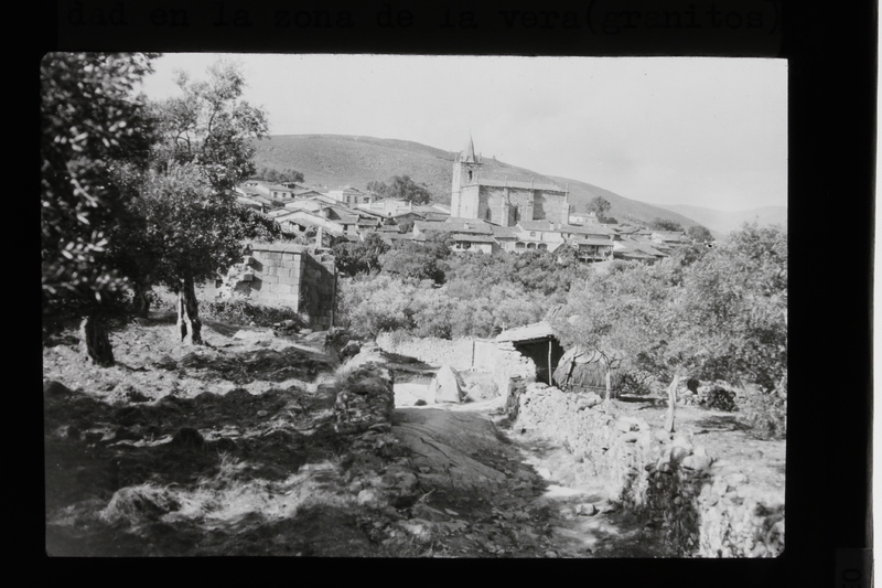 - Título en la tira mecanografiada en el borde superior: "Gerte (Cáceres). Aspecto de la ciudad en la zona de la vera (granito)"