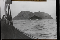 - Los islotes de Montaña Clara y Roque de los Infiernos del Archipiélago Chinijo, Canarias, vistos desde un buque donde hay se ven dos hombres a bordo