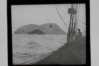 - Los islotes de Montaña Clara y Roque de los Infiernos del Archipiélago Chinijo en Canarias, vistos desde un buque donde se ven dos hombres a bordo