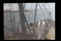 - Proa de un barco vista a través de los mástiles con la isla de Lanzarote al fondo