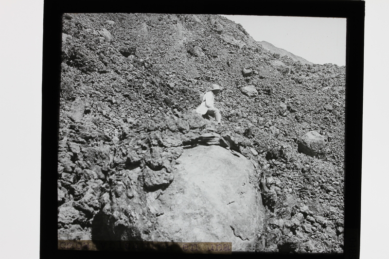 - Un hombre en una montaña de lava junto a una bomba volcánica de gran tamaño