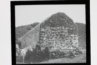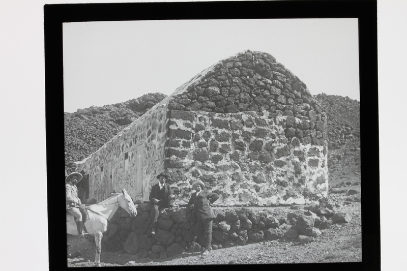 - Tres hombres, uno a caballo, junto a un muro lateral del refugio de Altavista en el volcán del Teide, en la isla de Tenerife, Canarias