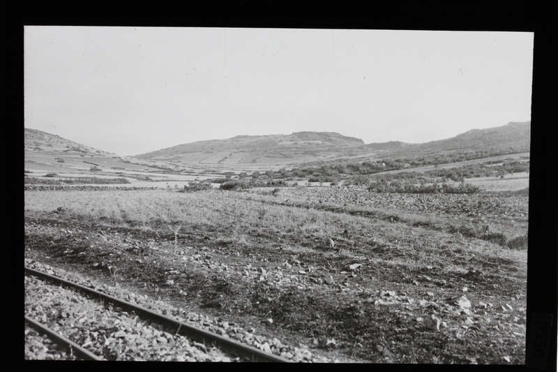 - Terrero por donde pasan vías de tren y se ve el volcán de las Mesas en la provincia de Ciudad Real