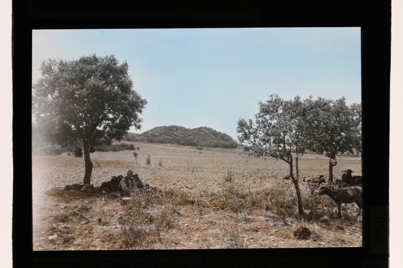 - Hombre y cabras a la sombra de unos árboles con unas formaciones basálticas detrás en la zona de Brazatortas, Ciudad Real