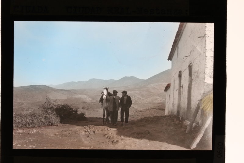- Dos hombres con un caballo junto a un edificio en la zona de Mestanza, Ciudad Rela
