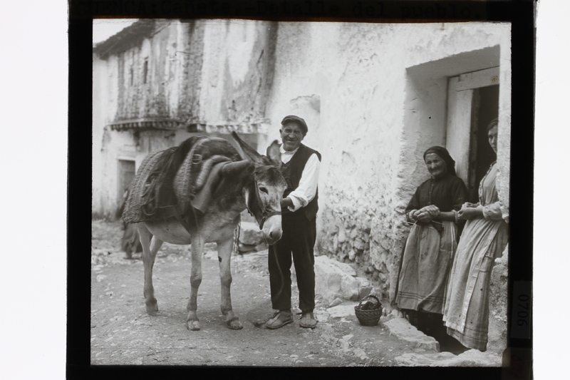 - Un hombre con un burro y dos mujeres posan en una calle de Cañete, Cuenca