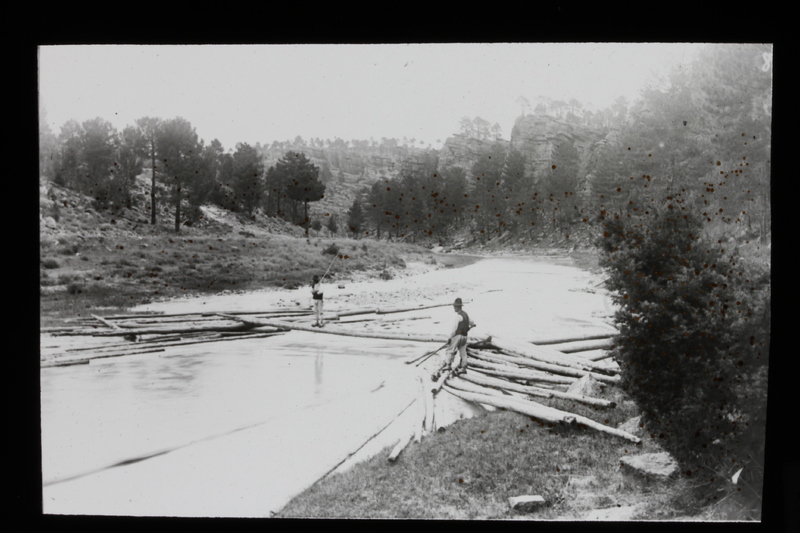 - Dos hombres transportando troncos de una maderada por el río Cabriel en la zona de Pajaroncillo, Cuenca