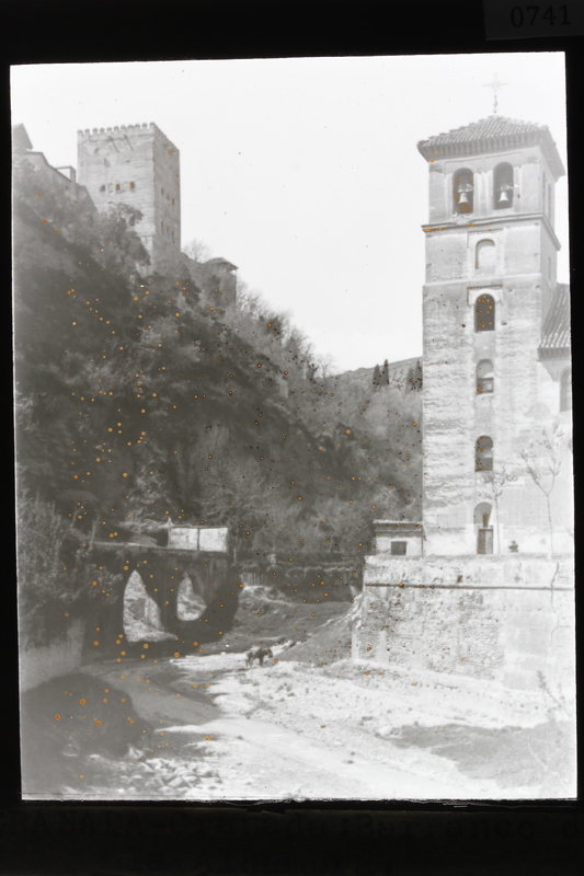 - Torre de la iglesia de San Pedro y San Pablo en Granada, junto a un puente y a los pies de la Alhambra