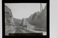 - Dos hombres en un puente de la vía del tren que transcurre entre formaciones rocosas en la zona de Baides, Guadalajara