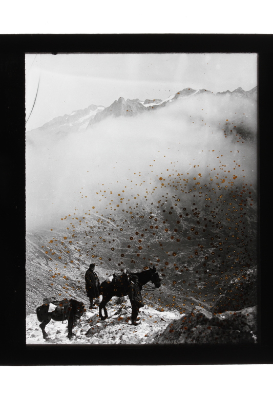 - Dos hombres con caballos observan el pico de la Maladeta en los Pirineos de Huesca desde el puerto de Viella en Lleida