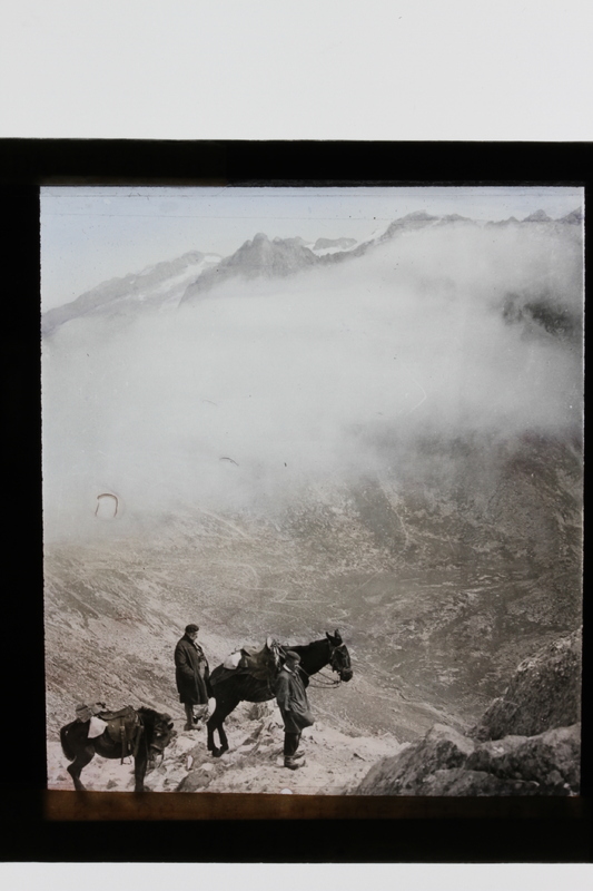 - Dos hombres con caballos observan el pico de la Maladeta en los Pirineos de Huesca desde el puerto de Viella en Lleida