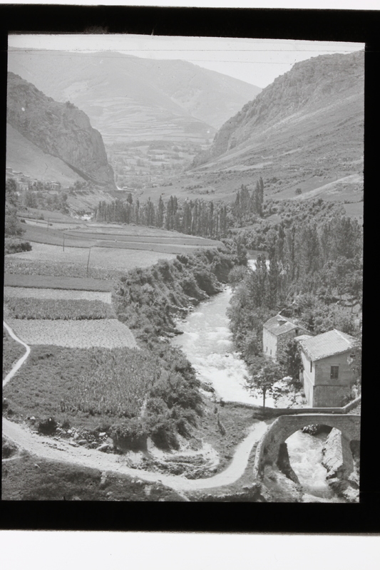 - Vista del valle del río Najerilla con unas viviendas y un puente, La Rioja