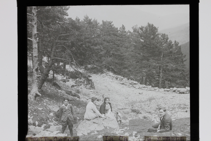 - Dos hombres y dos mujeres posando junto a la calzada romana del puerto de la Fuenfría, en la sierra de Guadarrama, Madrid