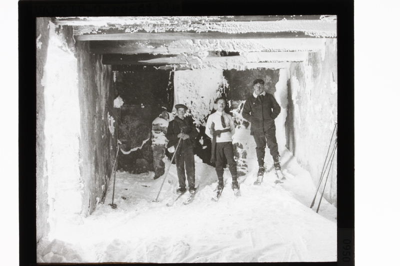 - Cuatro hombres con esquís en el interior de una construcción vacía y llena de nieve, en la sierra de Guadarrama, Madrid