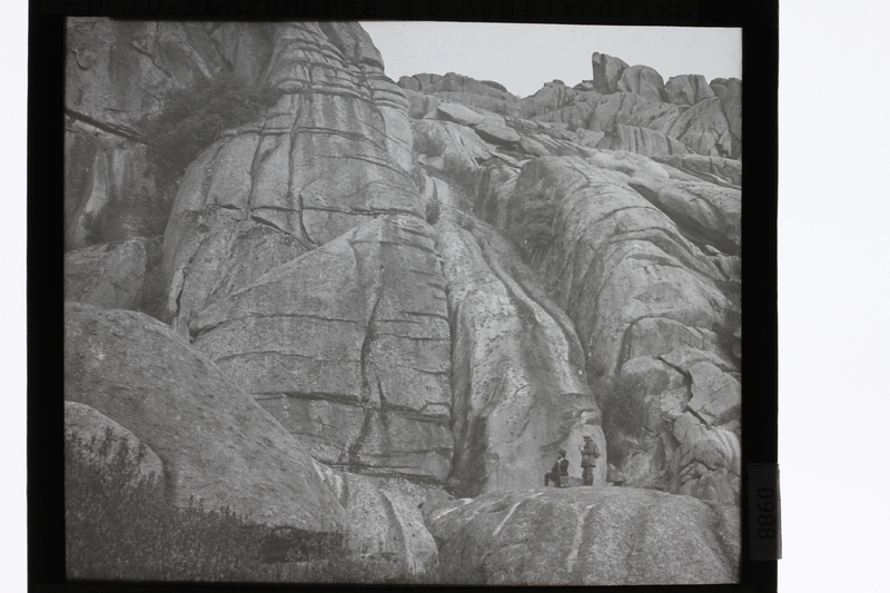 - Dos hombres junto a formaciones rocosas con diaclasas en La Pedriza, en la sierra de Guadarrama, Madrid