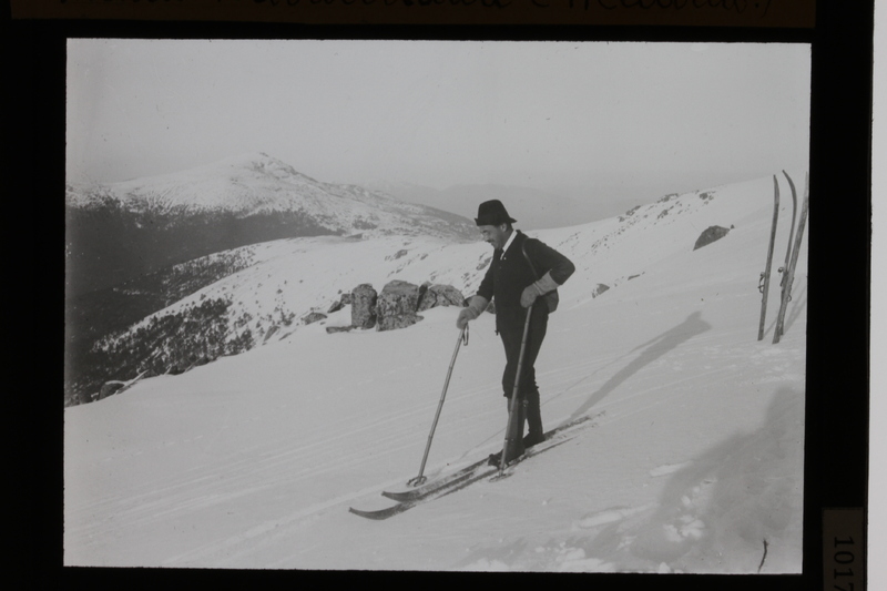 - Un hombre esquiando en el alto de las Guarramillas con el pico de Peñalara al fondo, sierra de Guadarrama