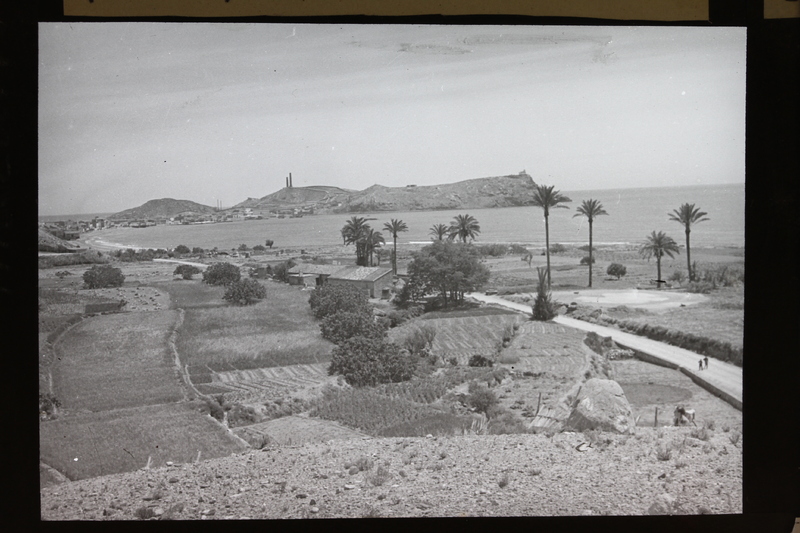 - Vista de campos y carretera junto a la línea de costa del puerto de Mazarrón, Murcia