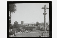 - Vista de Riaza con una cruz de crucero en primer término y hombres y ganado por una de las calles