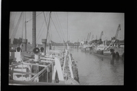 - Barcos, fotografiados desde otro buque, en dársenas del río Guadalquivir, con un puente de hierro de Sevilla al fondo y lo que podría ser la torre del Pabellón de Argentina de la Exposición Iberoamericana de 1929