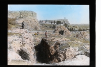 - Hombres junto a una grieta del terremoto de Carmona de 1504, con la torre de telégrafo óptico del Picacho al fondo