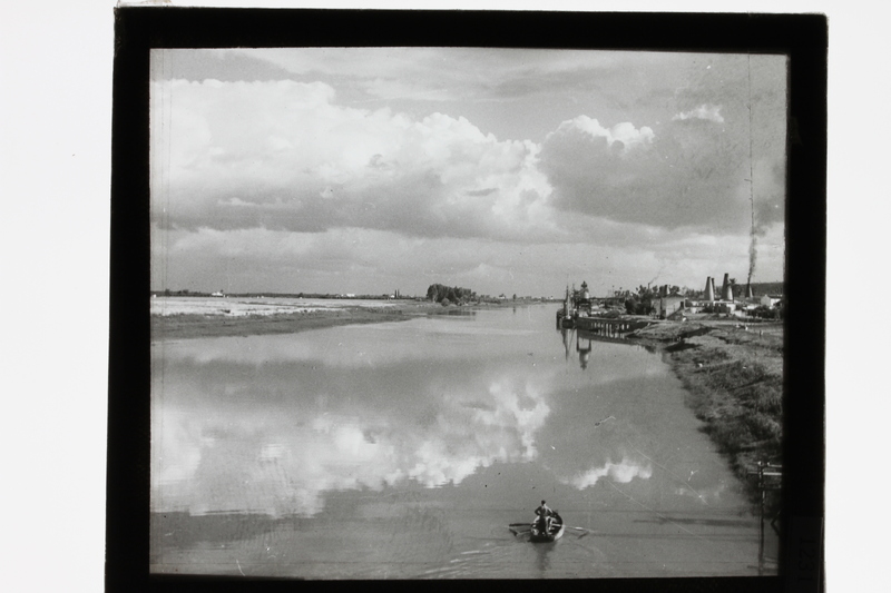 - Una barca navega por el río Guadalquivir con la fabrica de loza de San Juan de Aznalfarache al fondo