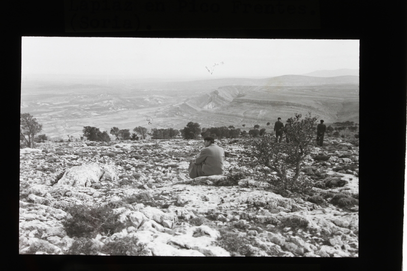 - Hombre sentado y otros caminando en un lapiaz de Pico Frentes, Soria