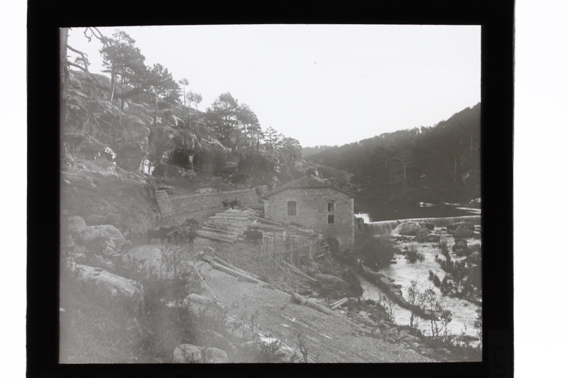 - Edificio junto al río Duero junto a troncos cortados y ganado en zona de pinares