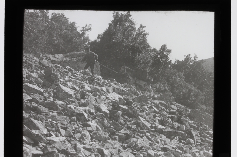 - Un hombre tira de un burro en una ladera de pedriza en los Montes de Toledo