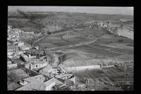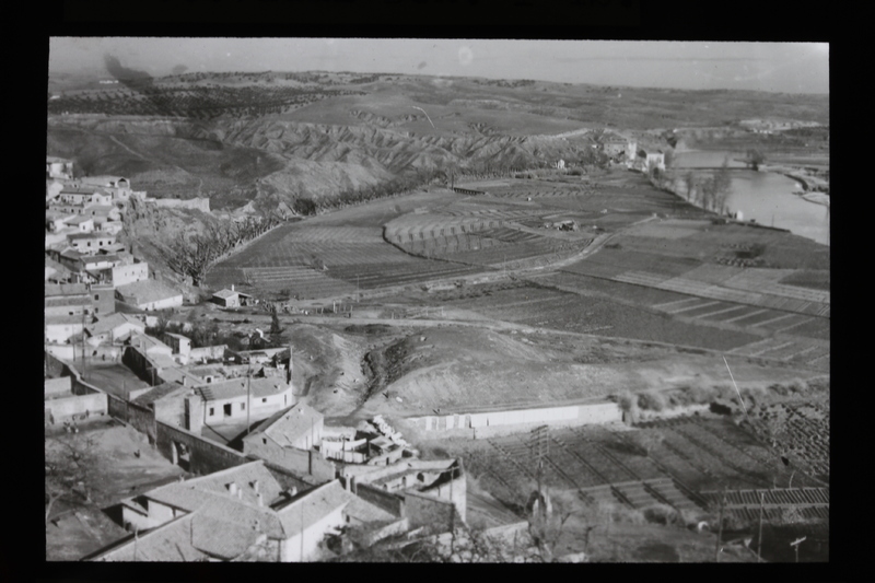 - Vista del barrio de Antequeruela-Covachuelas de Toledo, de campos de cultivo y del río Tajo, desde el Miradero