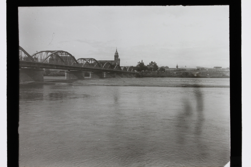 - Vista del río Tajo con el puente de hierro y la iglesia de Santa María la Mayor en Talavera de la Reina, Toledo