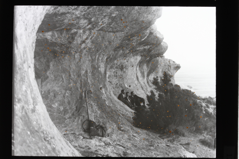 - Tres hombres sentados en el abrigo de Tortosilla en Ayora, Valencia