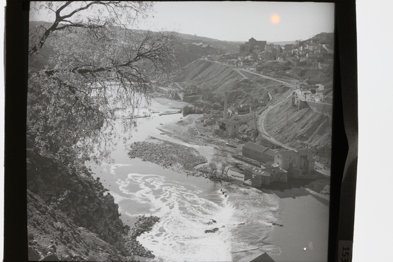 - Vista del río Tajo a su paso por Toledo y sus centrales eléctricas, con el convento de San Gil al fondo