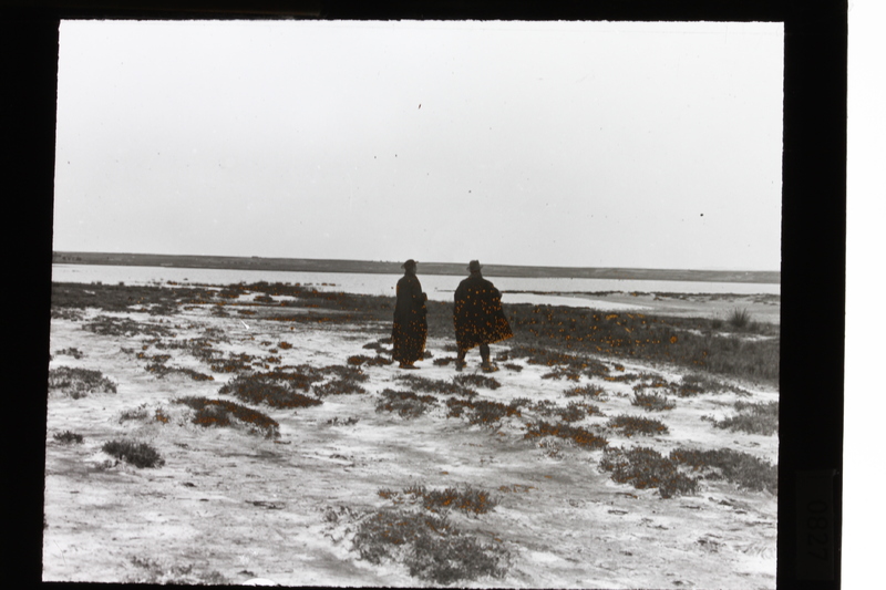 - Dos hombres observan la laguna de Sariñena, Huesca, con eflorescencias salinas y plantas de sedum en primer término