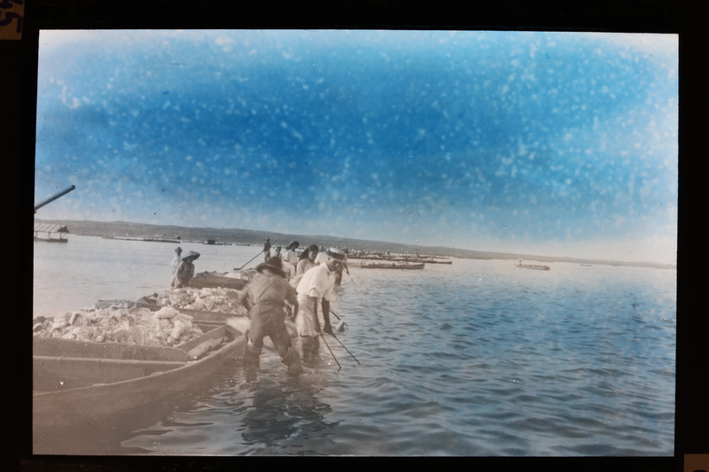 - Hombres recogiendo sal en las salinas de Torrevieja, Alicante, junto a barcas de transporte