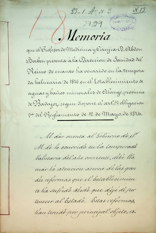 Memoria que Abdon Berben presenta á la Direccion de Sanidad del Reino de cuanto ha ocurrido en la temporada balnearia de 1876 en el establecimiento de aguas y baños minerales de Alange, provincia de Badajoz, segun dispone..