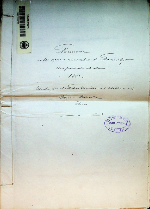 Memoria de las aguas minerales de Marmolejo correspondiente al año 1885 escrita por el medico director del establecimiento Joaquin Fernandez Flores