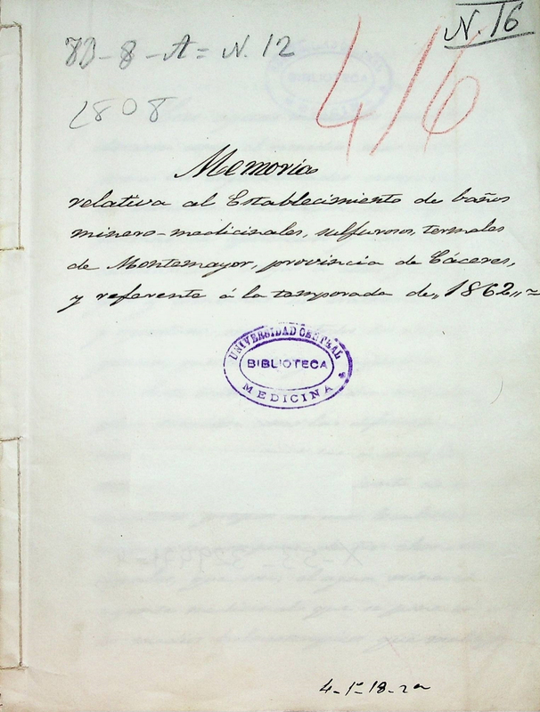 Memoria relativa al establecimiento de baños minero-medicinales, sulfurosos, termales de Montemayor, provincia de Cáceres, y referente á la temporada de 1862