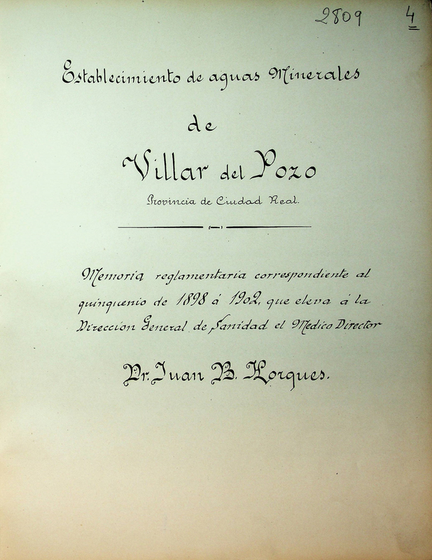 Establecimiento de aguas minerales de Villar del Pozo, provincia de Ciudad Real : memoria reglamentaria correspondiente al quinquenio de 1898 á 1902, que eleva á la Dirección General de Sanidad el medico director Dr. Juan B. Horques