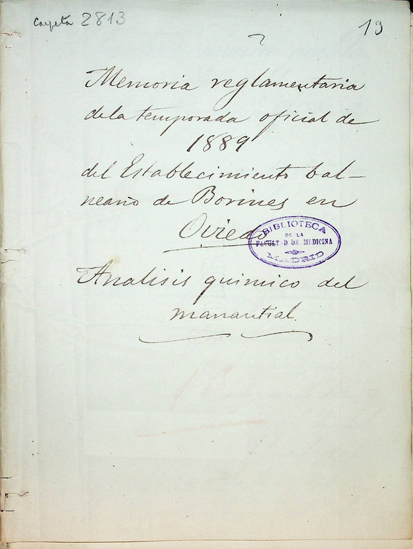 Memoria reglamentaria de la temporada oficial de 1889 del establecimiento de Borines en Oviedo : análisis químico del manantial