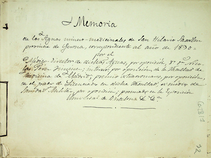 Memoria de las aguas minero-medicinales de San Hilario Sacalm provincia de Gerona, correspondiente al año de 1890